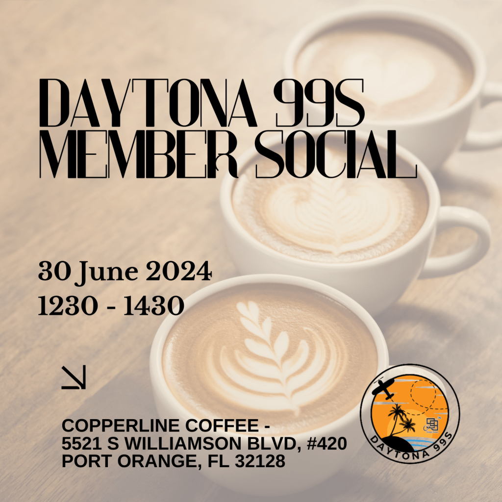 | June Social! Upcoming Coffee Social on June 30June 30 12:30PM – 2:30PM Join us for a casual and fun coffee social on June 30th at Copperline Coffee, Port Orange. It’s a great opportunity to connect with fellow aviation enthusiasts, share stories, and enjoy some delicious coffee together. Mark your calendars and stay tuned for more details! |