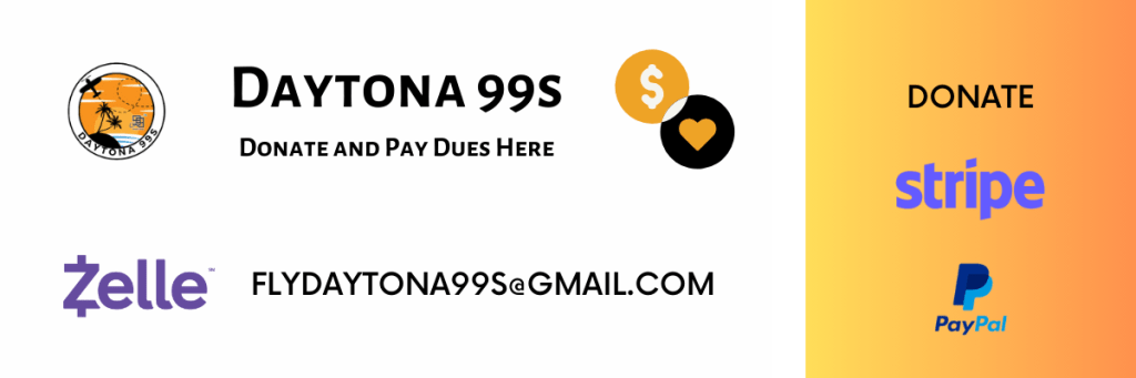 Dues Reminder: Friendly reminder that annual dues are due! You can conveniently pay via Zelle using flydaytona99s@gmail.com. If you prefer to pay by check, simply let us know, and we’ll arrange the details.